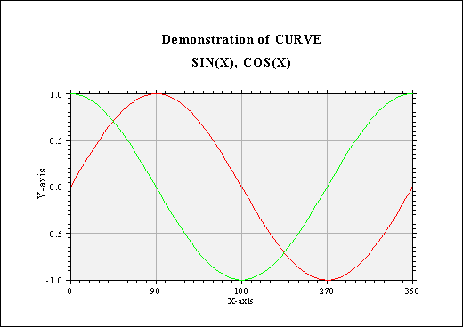 PROGRAM EXA_1 C USE DISLIN for Fortran 90! PARAMETER (N=301) DIMENSION XRAY(N),Y1RAY(N),Y2RAY(N) PI=3.1415926 FPI=PI/180. STEP=360./(N-1) DO I=1,N XRAY(I)=(I-1)*STEP X=XRAY(I)*FPI Y1RAY(I)=SIN(X) Y2RAY(I)=COS(X) END DO CALL DISINI CALL PAGERA CALL COMPLX CALL AXSPOS(450,1800) CALL AXSLEN(2200,1200) CALL NAME('X-axis','X') CALL NAME('Y-axis','Y') CALL LABDIG(-1,'X') CALL TICKS(10,'XY') CALL TITLIN('Demonstration of CURVE',1) CALL TITLIN('SIN(X), COS(X)',3) CALL GRAF(0.,360.,0.,90.,-1.,1.,-1.,0.5) CALL TITLE CALL COLOR('RED') CALL CURVE(XRAY,Y1RAY,N) CALL COLOR('GREEN') CALL CURVE(XRAY,Y2RAY,N) CALL COLOR('FORE') CALL DASH CALL XAXGIT CALL DISFIN END