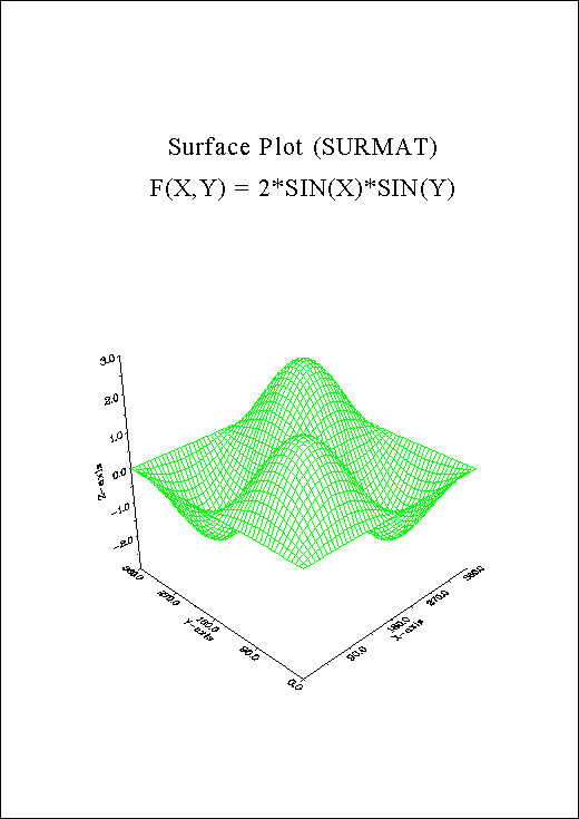 PROGRAM EXA_11 C USE DISLIN for Fortran 90! CHARACTER*60 CTIT1,CTIT2 EXTERNAL ZFUN CTIT1='Surface Plot (SURFUN)' CTIT2='F(X,Y) = 2*SIN(X)*SIN(Y)' CALL SETPAG('DA4P') CALL DISINI CALL PAGERA CALL COMPLX CALL AXSPOS(200,2600) CALL AXSLEN(1800,1800) CALL NAME('X-axis','X') CALL NAME('Y-axis','Y') CALL NAME('Z-axis','Z') CALL TITLIN(CTIT1,2) CALL TITLIN(CTIT2,4) CALL VIEW3D(-5.,-5.,4.,'ABS') CALL GRAF3D(0.,360.,0.,90.,0.,360.,0.,90.,-3.,3.,-3.,1.) CALL HEIGHT(50) CALL TITLE CALL SURFUN(ZFUN,1,10.,1,10.) CALL DISFIN END FUNCTION ZFUN(X,Y) FPI=3.14159/180. ZFUN=2*SIN(X*FPI)*SIN(Y*FPI) END