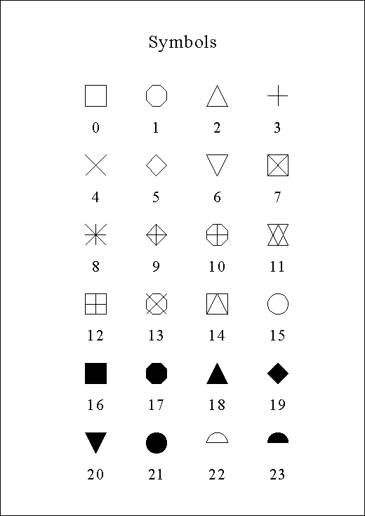 PROGRAM EXA_3 C USE DISLIN for Fortran 90! CHARACTER*20 CTIT,CSTR*2 CTIT='Symbols' CALL SETPAG('DA4P') CALL DISINI CALL COMPLX CALL PAGERA CALL HEIGHT(60) NL=NLMESS(CTIT) CALL MESSAG(CTIT,(2100-NL)/2,200) CALL HEIGHT(50) CALL HSYMBL(120) NY=150 DO I=0,23 IF(MOD(I,4).EQ.0) THEN NY=NY+400 NXP=550 ELSE NXP=NXP+350 END IF IF(I.LT.10) THEN WRITE(CSTR,'(I1)') I ELSE WRITE(CSTR,'(I2)') I END IF NL=NLMESS(CSTR)/2 CALL MESSAG(CSTR,NXP-NL,NY+150) CALL SYMBOL(I,NXP,NY) END DO CALL DISFIN END