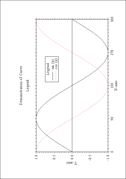 PROGRAM EXA_7 C USE DISLIN for Fortran 90! PARAMETER(N=301) DIMENSION XRAY(N),Y1RAY(N),Y2RAY(N) CHARACTER*14 CBUF FPI=3.1415926/180. STEP=360./(N-1) DO I=1,N XRAY(I)=(I-1)*STEP X=XRAY(I)*FPI Y1RAY(I)=SIN(X) Y2RAY(I)=COS(X) END DO CALL DISINI CALL PAGERA CALL COMPLX CALL AXSPOS(450,1800) CALL AXSLEN(2200,1200) CALL NAME('X-axis','X') CALL NAME('Y-axis','Y') CALL TITLIN('Demonstration of CURVE',1) CALL TITLIN('Legend',3) CALL LABDIG(-1,'X') CALL TICKS(10,'XY') CALL GRAF(0.,360.,0.,90.,-1.,1.,-1.,0.5) CALL TITLE CALL XAXGIT CALL CHNCRV('LINE') CALL CURVE(XRAY,Y1RAY,N) CALL CURVE(XRAY,Y2RAY,N) CALL LEGINI(CBUF,2,7) ! Legend statements NX=NXPOSN(190.) NY=NYPOSN(0.75) CALL LEGPOS(NX,NY) CALL LEGLIN(CBUF,'sin (x)',1) CALL LEGLIN(CBUF,'cos (x)',2) CALL LEGTIT('Legend') CALL LEGEND(CBUF,3) CALL DISFIN END