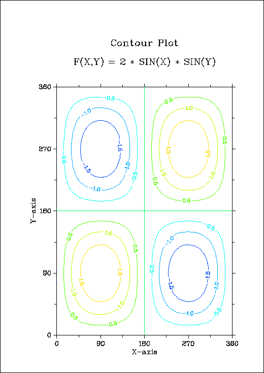 %GCL // Contour Plot N = 100 FLOAT ZMAT[N,N], XRAY[N] FPI = 3.1415927 / 180. STEP = 360. / (N - 1) X = FALLOC (N) * STEP Y = FALLOC (N) * STEP DO J = 0, N - 1 ZMAT[*,J] = 2 * SIN (X * FPI) * SIN (Y[J] * FPI) END DO METAFL ('CONS') SETPAG ('DA4P') DISINI () COMPLX () PAGERA () INTAX () AXSPOS (450, 2670) NAME ('X-axis', 'X') NAME ('Y-axis', 'Y') TITLIN ('Contour plot', 2) TITLIN ('F(X,Y) = 2 * SIN(X) * SIN(Y)', 4) GRAF (0.,360.,0.,90.,0.,360.,0.,90.) HEIGHT (30) DO I = 1,9 ZLEV = -2.0 + (I - 1) * 0.5 IF (I == 5) LABELS ('NONE', 'CONTUR') ELSE LABELS ('FLOAT', 'CONTUR') END IF CONTUR (X, N, Y, N, ZMAT, ZLEV) END DO HEIGHT (50) TITLE () DISFIN ()