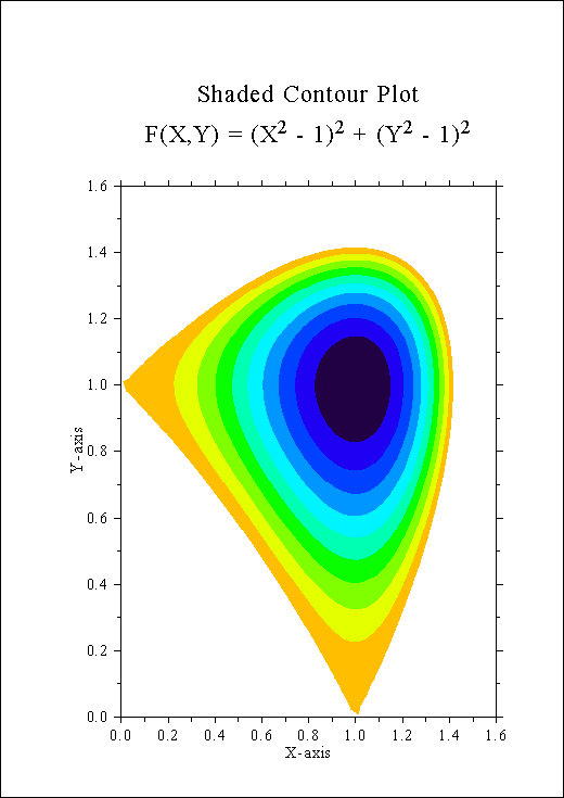 %GCL // Shaded Contour Plot N = 100 FLOAT ZMAT[N,N], XRAY[N], YRAY[N], ZLEV[12] STEP = 1.6 / (N - 1) XRAY = FALLOC (N) * STEP YRAY = FALLOC (N) * STEP X = XRAY * XRAY - 1 DO J = 0, N - 1 Y=YRAY[J] * YRAY[J] - 1. ZMAT[*,J] = X * X + Y * Y END DO METAFL ('CONS') SETPAG ('DA4P') DISINI () COMPLX () PAGERA () NAME ('X-axis', 'X') NAME ('Y-axis', 'Y') MIXALF () TITLIN ('Shaded Contour Plot', 1) TITLIN ('F(X,Y) = (X[2$ - 1)[2$ + (y[2$ - 1)[2$', 3) SHDMOD ('POLY', 'CONTUR') AXSPOS (450, 2670) GRAF (0., 1.6, 0., 0.2, 0., 1.6, 0., 0.2) HEIGHT (30) DO I = 0, 11 ZLEV[11-I] = 0.1 + I * 0.1 END DO CONSHD (XRAY, N, YRAY, N, ZMAT, ZLEV, 12) HEIGHT (50) TITLE () DISFIN ()
