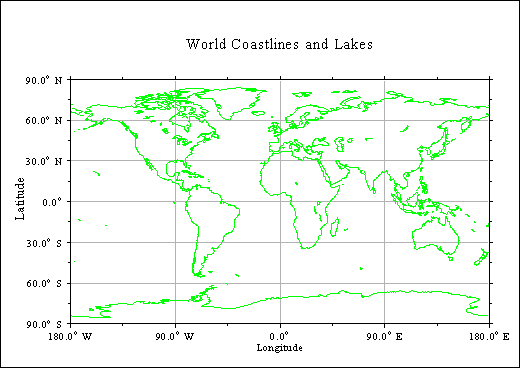 METAFL ('CONS') DISINI () PAGERA () COMPLX () AXSPOS (400, 1850) AXSLEN (2400, 1400) NAME ('Longitude', 'X') NAME ('Latitude', 'X') TITLIN ('World coastlines and lakes', 3) LABELS ('MAP', 'XY') GRAFMP (-180.,180.,-180.,90.,-90.,90.,-90.,30.) GRIDMP (1, 1) COLOR ('GREEN') WORLD () COLOR ('FORE') HEIGHT (50) TITLE () DISFIN ()